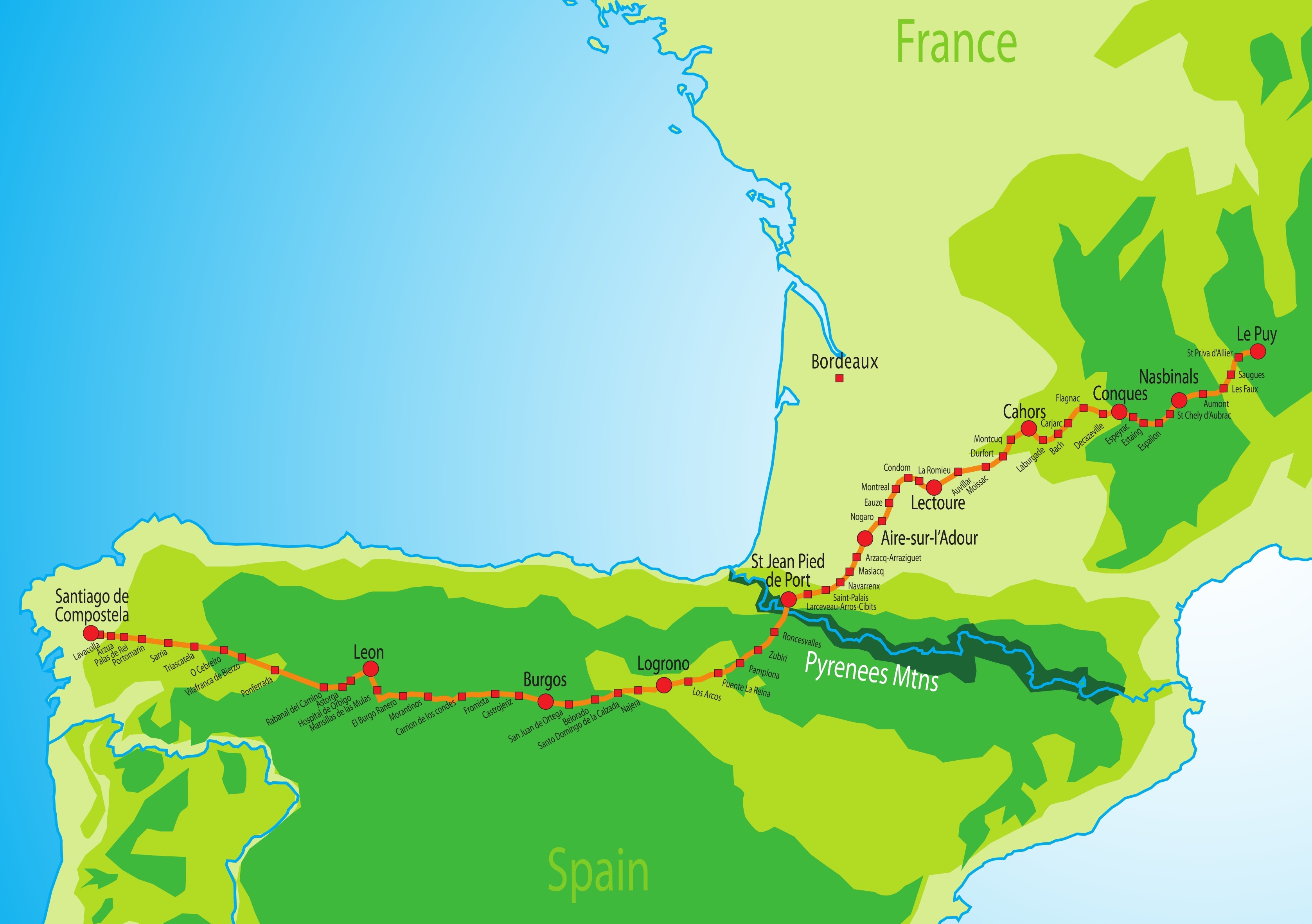 One of the major pilgrimage routes in France was from Le Puy crossing the Pyrenees at the Roncesvalles Pass, joining other trails at Puente la Reina in Navarra (near Pamplona) to form a single path across northern Spain to the shrine at Santiago de Compostela. The fascinating Spanish part of El Camino de Santiago runs some 800km from the Roncesvalles pass through Puente la Reina, La Rioja, Burgos, Leon and finally crossing Galicia to Santiago.